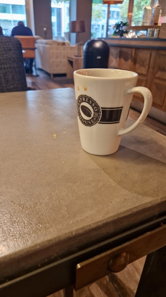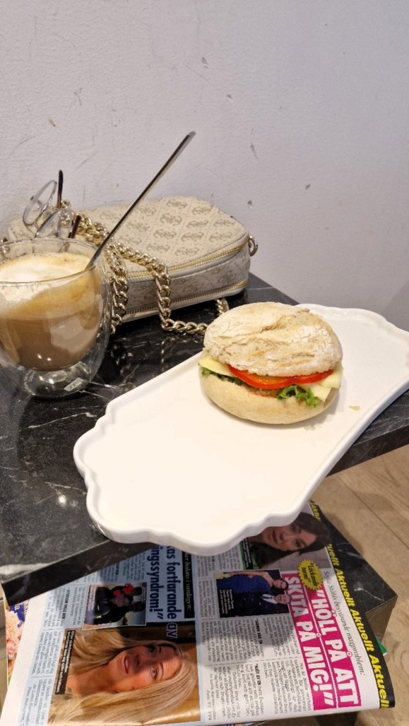 Han hade fastnat i någon kö så kom ett par minuter sent, och hade inte hunnit med att handla innan heller, så sprang iväg då färgen satt i håret och bjöd mig på frukost. Lite bortskämd får man allt bli eller. Till det så är det så skönt med tiden klockan åtta då jag är morgonpigg. Vill ha gjort alla måsten tidigt.