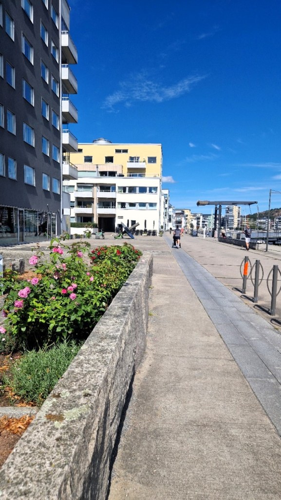 Fortsatte att gå mot Sannegården. Det är egentligen en hamn, men har växt med mycket bostäder och restauranger runt hamnen. Husen på berget är slottsberget och gammal bebyggelse.