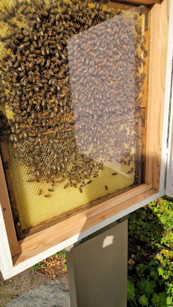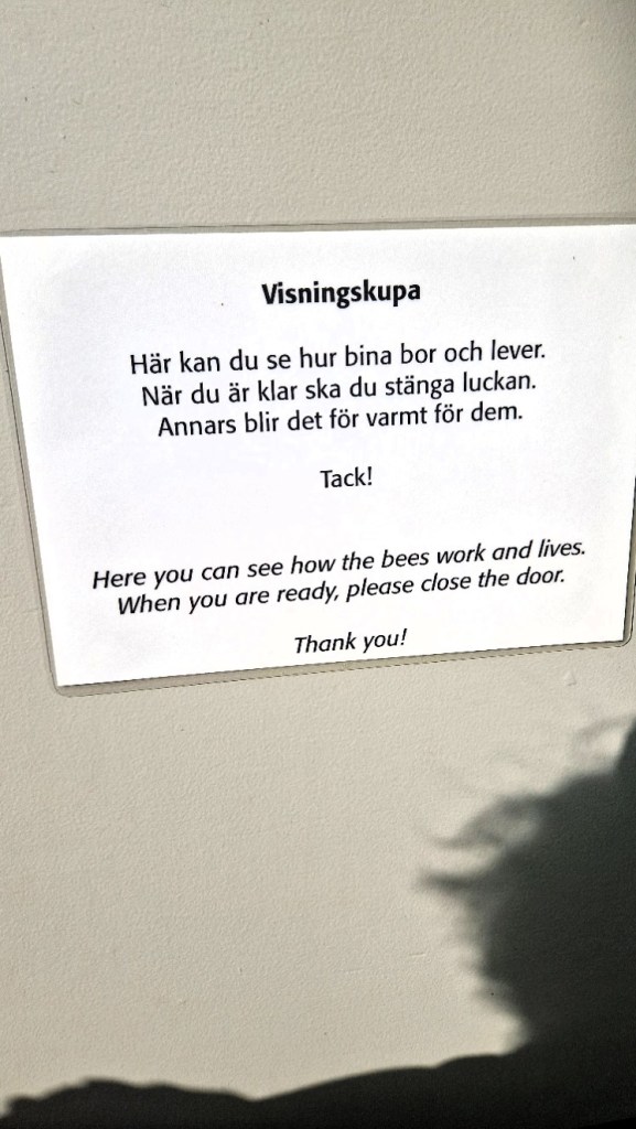 Det här bisamhället har jag inte sett tidigare. Klart jag blev nyfiken då jag såg ett vitt skåp och gick fram. Hittade detta där man kunde kika in hos bina då dom gjorde sin honung. Viktigt att stänga skåpet efteråt bara. Tycker ändå det är bra att sådant här finns för att fler ska kunna lära sig hur saker och ting fungerar. Honung kommer någonstans ifrån och inte bara något man köper i affären.