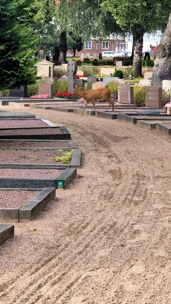 Precis då min dotter la ut på snap om hennes kompis så mötte vi det här rådjuret ( eller är det dovhjort? ) på kyrkogården. Det är inte helt ovanligt, men han stannade till, tittade på oss så mycket så min man reagerade på det, och sen strosade det vidare.