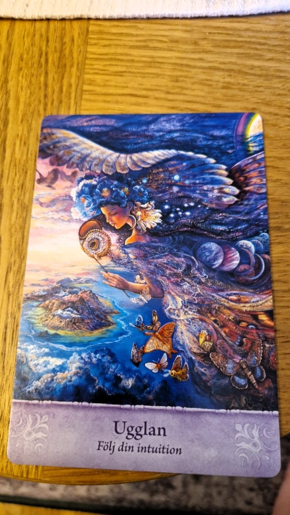 och idag valde jag mystikens visdom. Som jag sagt tidigare, jag övar man bara och är långt ifrån duktig. Det jag har lärt mig är att man alltid ska känna in kortet och se detaljerna. Det man fastnar för just där och då kan säga något om vart man själv står. Kortet är bara ett hjälpmedel för att uppmärksamma det.