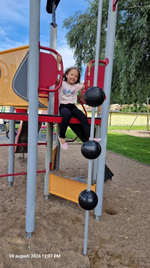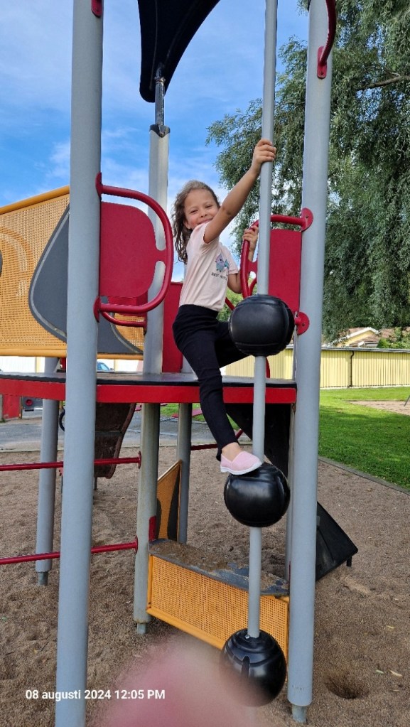 Ja så fort hon får chansen vill hon klättra. Dom har en liten klättervägg och där har hon inga problem alls med. Frågade henne om hon vill testa en större klättervägg och då berättade hon att hon redan gjort det. Då man skulle klättra där fick man ha sele och ett rep som fästes i taket. Berätta också att blev man rädd kunde man släppa allt så blev man nerhissad. Det var visst väldigt kul.