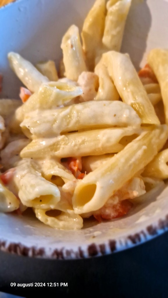 Nu blev inte bilden så bra då jag värme resterna efter middagen igår. Tänkte ändå dela med mig av receptet på maten jag gjorde igår. Har man bråttom , vill ha något enkelt så är det perfekt. Tar inte mycket längre tid än vad det tar för pastan att tillagas.