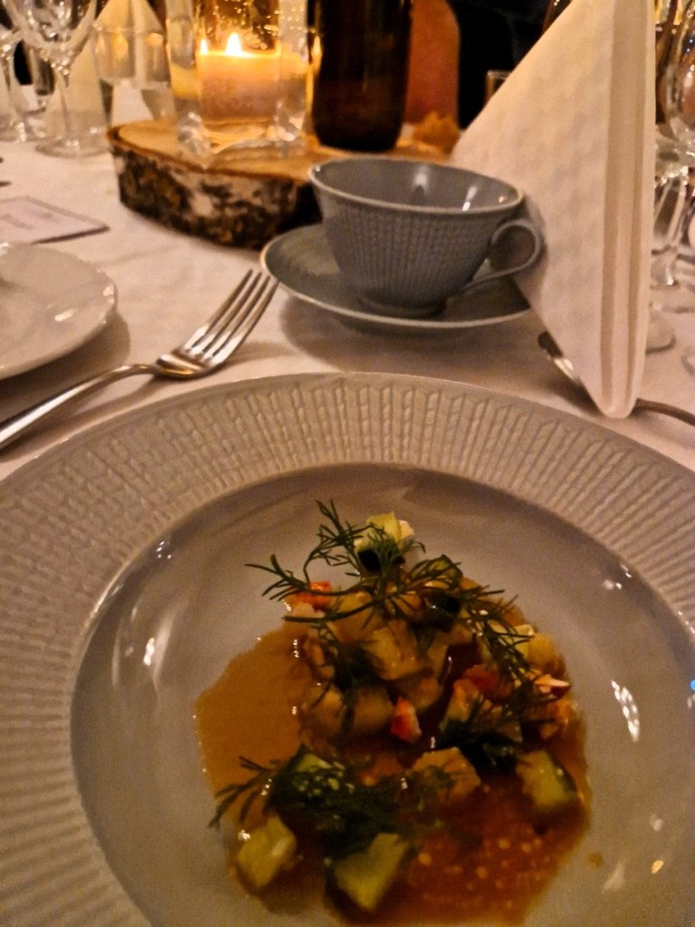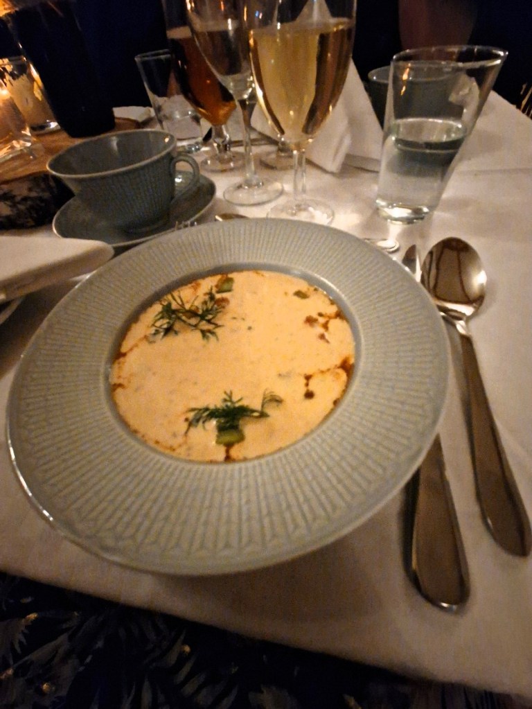 Vilken mat vi blev serverade alltså. Då vi kom till bordet så var förrätten förberedd. Blomkålssoppa med hummer och gurktartar. Så god alltså. Återigen en full pott på soppan.