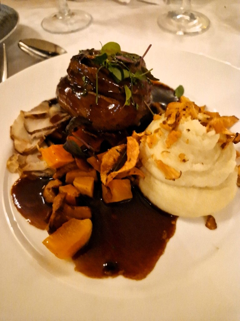 Till huvudrätt så fick vi hjortfilé med kronärtspuré. Wow, köttet bara smälte i munnen och det var inte en liten bit mat vi fick heller.