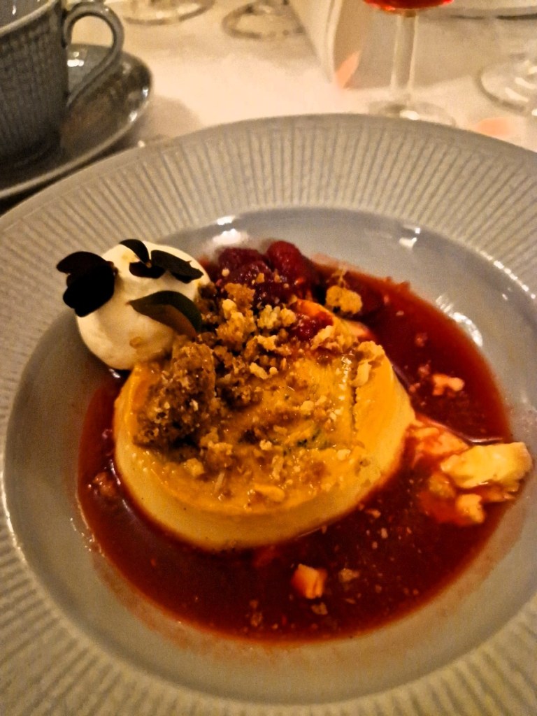 Creme caramell med hallonsås och lättvispad vit chokladmousse. Perfekt avslutning på middagen trodde vi men efteråt dukades det upp kaffe och tryffel. Kunde inte bli bättre